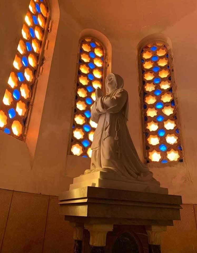تمثال السيدة العذراء مريم من الرخام الأبيض يرتفع خلف الهيكل على قاعدة جميلة ويتميز هذا التمثال بأن الوجه يشع روح السماحة والجمال الألهى العذرى والشعر مغطى بغطاء رأس مربوط على الطريقة التقليدية البسيطة وعينيها مرفوعة إلى السماء وتلبس قلادة الملكة وخاتم في كل صابع وقدميها تسحق رأس الحية، وتحمل بين يديها الكرة الأرضية التي يعلوها الصليب، وقد أنجز هذا التمثال في بروكسل وباركه النائب الأسقفى الرسولى يوم عيد القيامة الموافق 21 أبريل 1935.