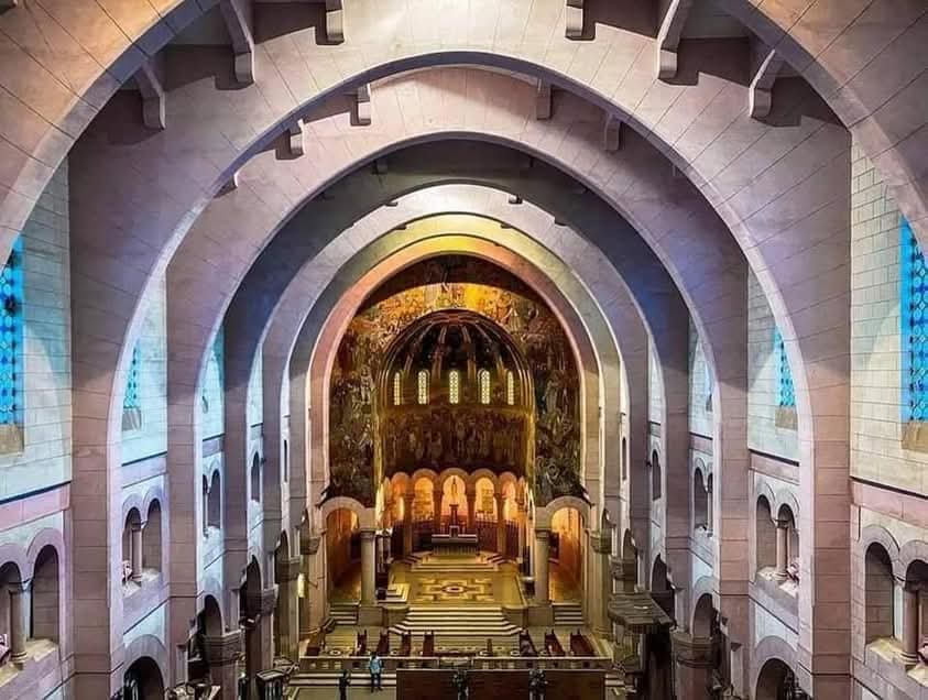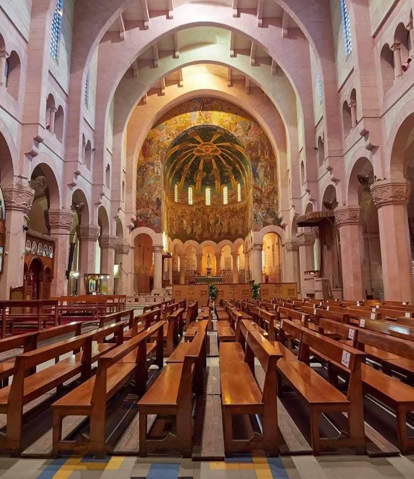 جدارن الكنيسة تحتوى على 14 صليب، كل منهم مرسوم عليه صورة تحكى ضرب الصليب حتى دفن السيد المسيح وتحت كل صليب يوجد مكان لوضع شمعة وتحته صليب أحمر ثم تم تدشينه وقت الإفتتاح وبين النوافذ صور لأماكن مرت بها السيدة العذراء مريم في حياتها، كما هناك صورة تضم مائتين وخمسة شخصية من القديسين من العهدين القديم والجديد ومع كل شخصية رمز يميزها ومن أبرزهم أدم وحواء، هابيل، نوح، يوسف، موسى وهارون، داود، إيليا ، وأطفال بيت لحم وغيرهم من القديسين.