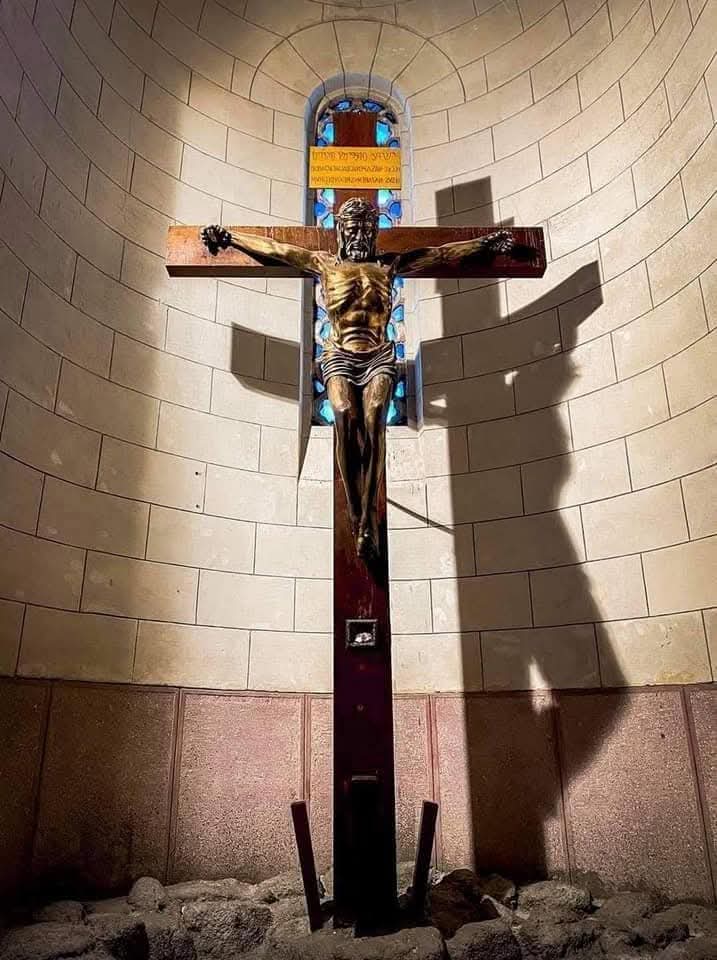 من مقتنيات الكنيسة صليب عليه تمثال السيد المسيح من النحاس بالحجم الطبيعى صنعه الفنان بييرليسكار وهو من أكبر فنانين النحت العالميين، ووضع في الكاتدرائية يوم الأحد 1 فبراير 1948 تنفيذاً لنذر الأسقف “انج مارى ايرال” الذي نذر أن يضعه في حالة إنتصار الحلفاء في الحرب العالمية الثانية، وعلى الصليب لافته مكتوب عليها هذا هو ملك اليهود بالثلاث لغات :اليونانية والرومانية والعبرية.